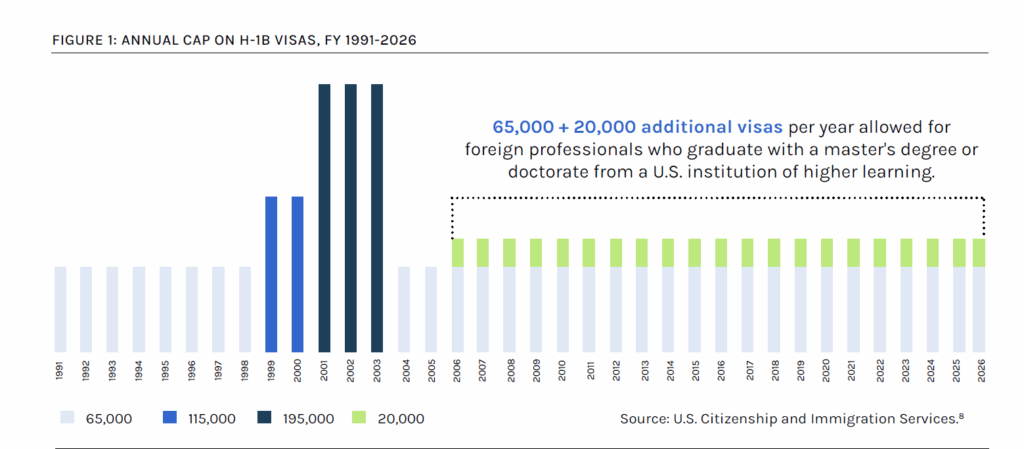 Since the category was created in 1990, Congress has limited the number of H-1Bs made available each year. The current annual statutory cap is 65,000 visas, with 20,000 additional visas for foreign professionals who graduate with a master’s degree or doctorate from a U.S. institution of higher learning (Figure 1). For Fiscal Year (FY) 2025, the cap was reached on December 2, 2024.