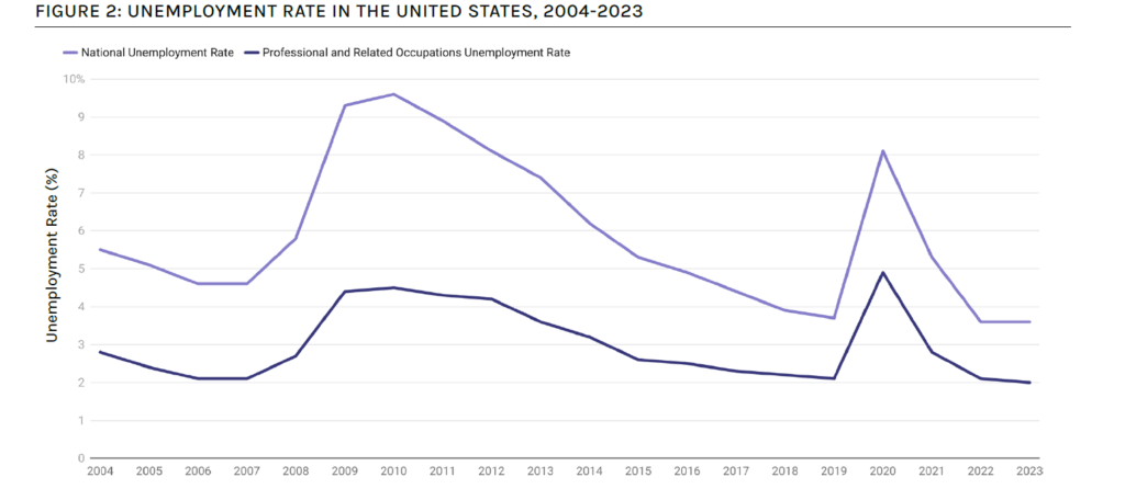 The economic contributions of H-1B workers in particular may increase the employment opportunities available to native-born workers in the United States. That is why unemployment rates are relatively low in occupations that employ large numbers of H-1B workers. Many occupations for which H-1Bs are routinely requested are found within the broader category of Professional and Related Occupations. Low unemployment rates in these occupations from 2004 through 2023 (even during the COVID-19 pandemic) indicate that demand for labor exceeded the supply (see Figure 2).