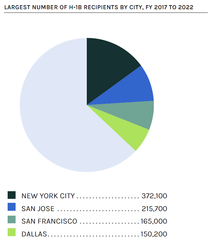 The economic benefits of the H-1B visa program are felt in communities all across the United States. For instance, from FY 2017 to FY 2022, the largest numbers of H-1B petitioners were based in the New York City metropolitan area (372,100 H-1B visa petition approvals, or 15.2 percent of all H-1B visa petition approvals in the country); followed by San Jose, California (215,700); San Francisco (165,000); and Dallas (150,200). The COVID-19 pandemic served as a reminder that the skills which H-1B workers bring with them can be critical in responding to national emergencies. For instance, between FY 2010 and FY 2019, eight U.S. companies that would later participate in the development of a COVID-19 vaccine—Gilead Sciences, Moderna Therapeutics, GlaxoSmithKline, Inovio, Johnson & Johnson Pharmaceuticals, Regeneron, Vir Therapeutics, and Sanofi—received approvals for 3,310 biochemists, biophysicists, chemists, and other scientists through the H-1B program. In addition, many medical doctors on the front lines of the pandemic are present in the United States on H-1B visas.
