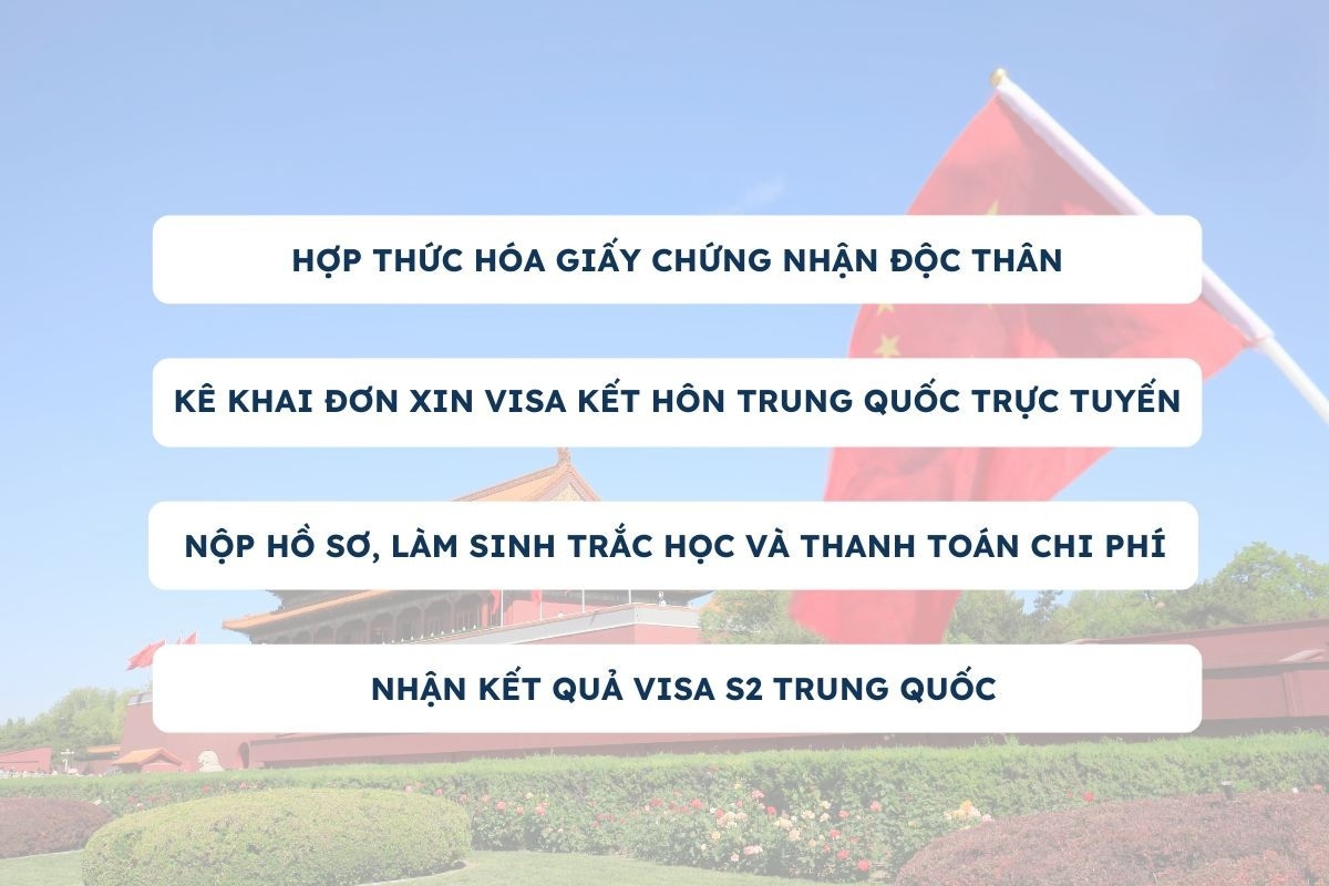 Để chuẩn bị hồ sơ xin Visa kết hôn Trung Quốc (Visa S2) đúng quy định, bạn cần hoàn tất các bước hợp thức hóa giấy tờ theo hướng dẫn dưới đây. Quy trình này giúp hồ sơ của bạn được công nhận hợp pháp tại Trung Quốc, đảm bảo thủ tục xin Visa S2 diễn ra nhanh chóng và thuận lợi.
