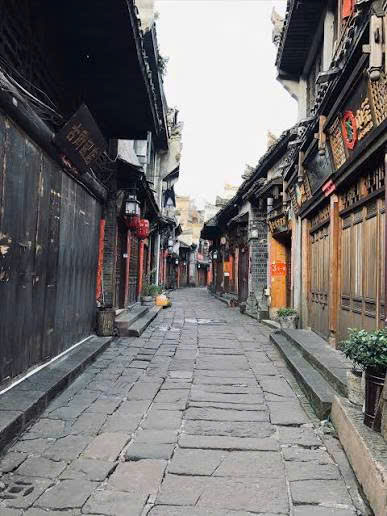 Bên trong cổ trấn là mạng lưới đường đá nhỏ hẹp, uốn lượn giữa các dãy nhà cổ. Mặt đường được lát bằng phiến đá xanh đã mòn theo thời gian, hai bên là cửa hàng thủ công, quán trà, quán ăn và nhà nghỉ. Kiến trúc tại đây không cầu kỳ, nhưng mang vẻ đẹp hài hòa và nhất quán, tạo cảm giác như đang bước vào một không gian tách biệt khỏi nhịp sống hiện đại.