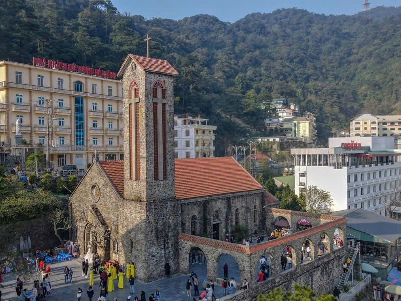 Nhà thờ nằm ở vị trí cao, phía trước là quảng trường rộng. Đây là khu vực tập trung đông du khách nhất, đặc biệt vào cuối tuần. Khi sương xuống, toàn bộ khu vực phủ lớp mờ nhẹ, tạo nên bối cảnh mang màu sắc cổ kính và khác biệt so với không gian đô thị.